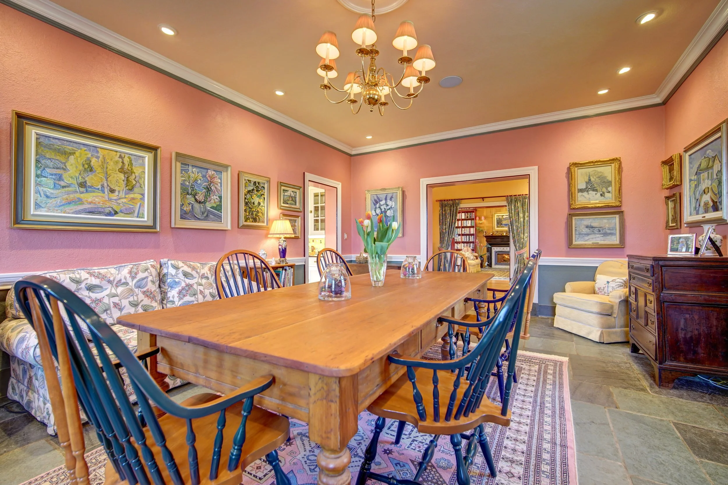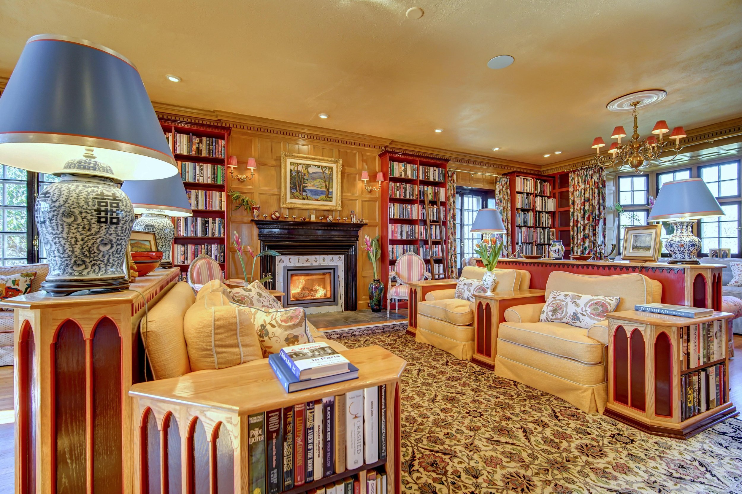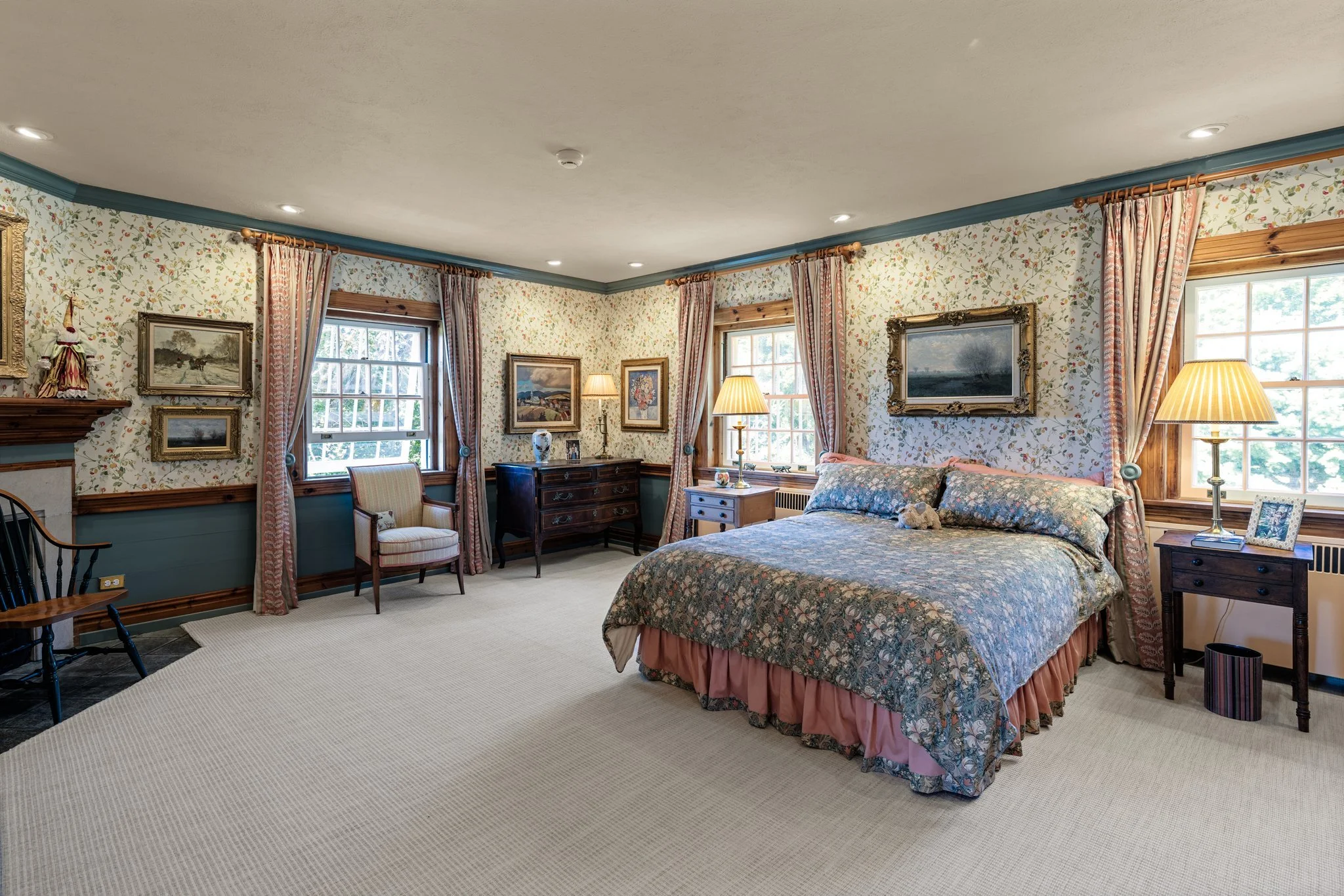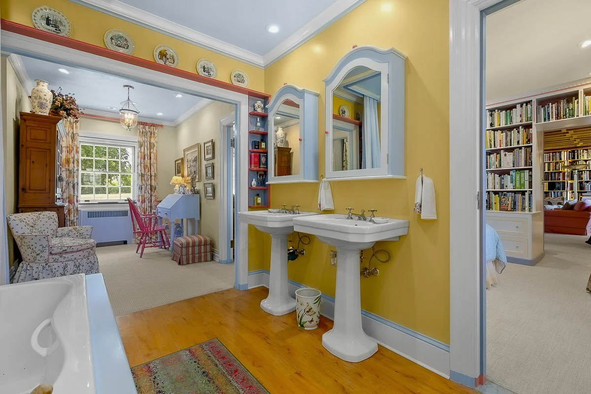 The main foyer sets the tone, with an elegant circular staircase at one end. A warm and welcoming great room anchors the west wing, with bespoke cabinetry and a Belgian, wood-burning fireplace. French doors open to a stand of rhododendrons, while bay windows illumine the space at either end. The east wing features a country kitchen, butler’s pantry, and dining room, while both bathrooms have been modernised.