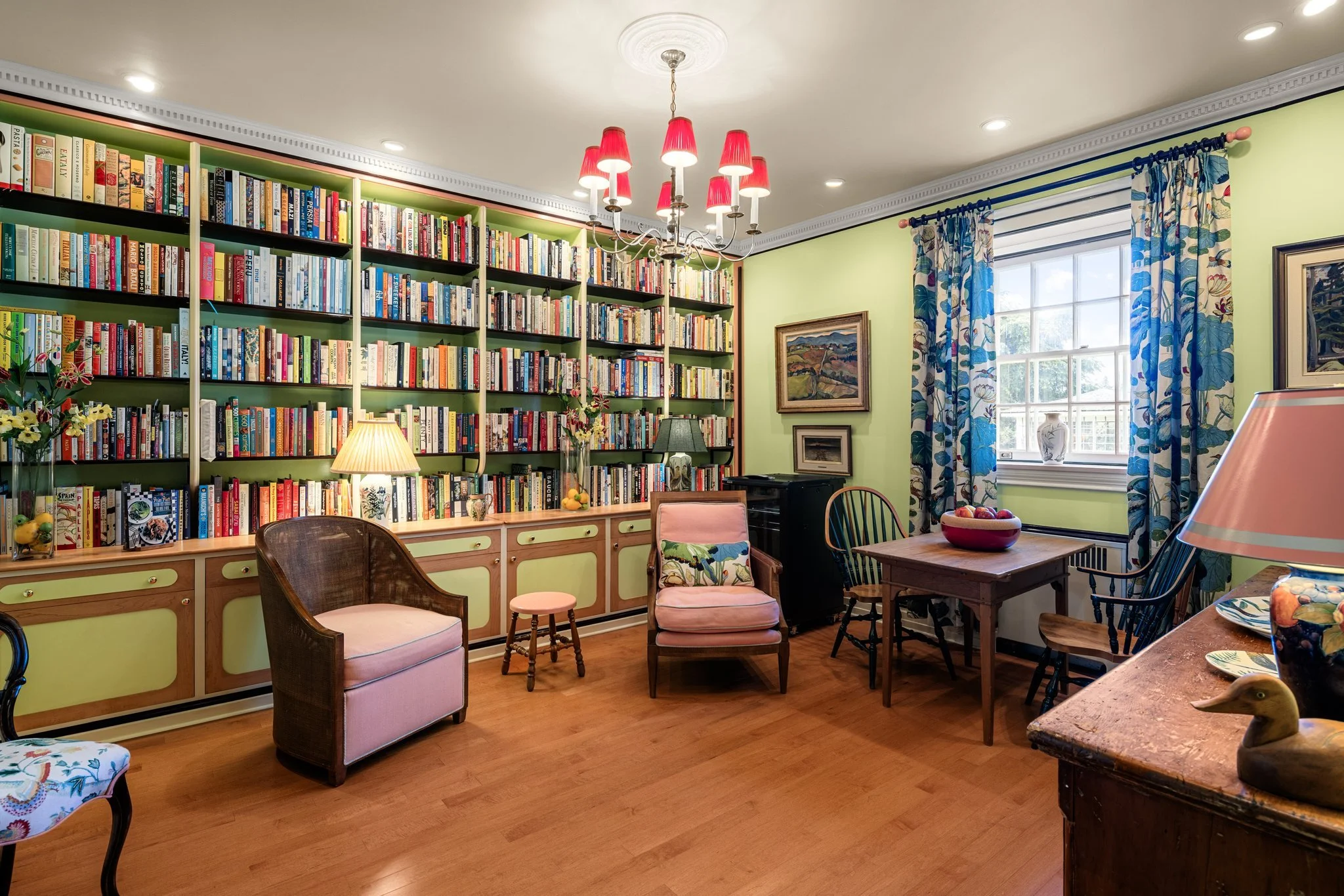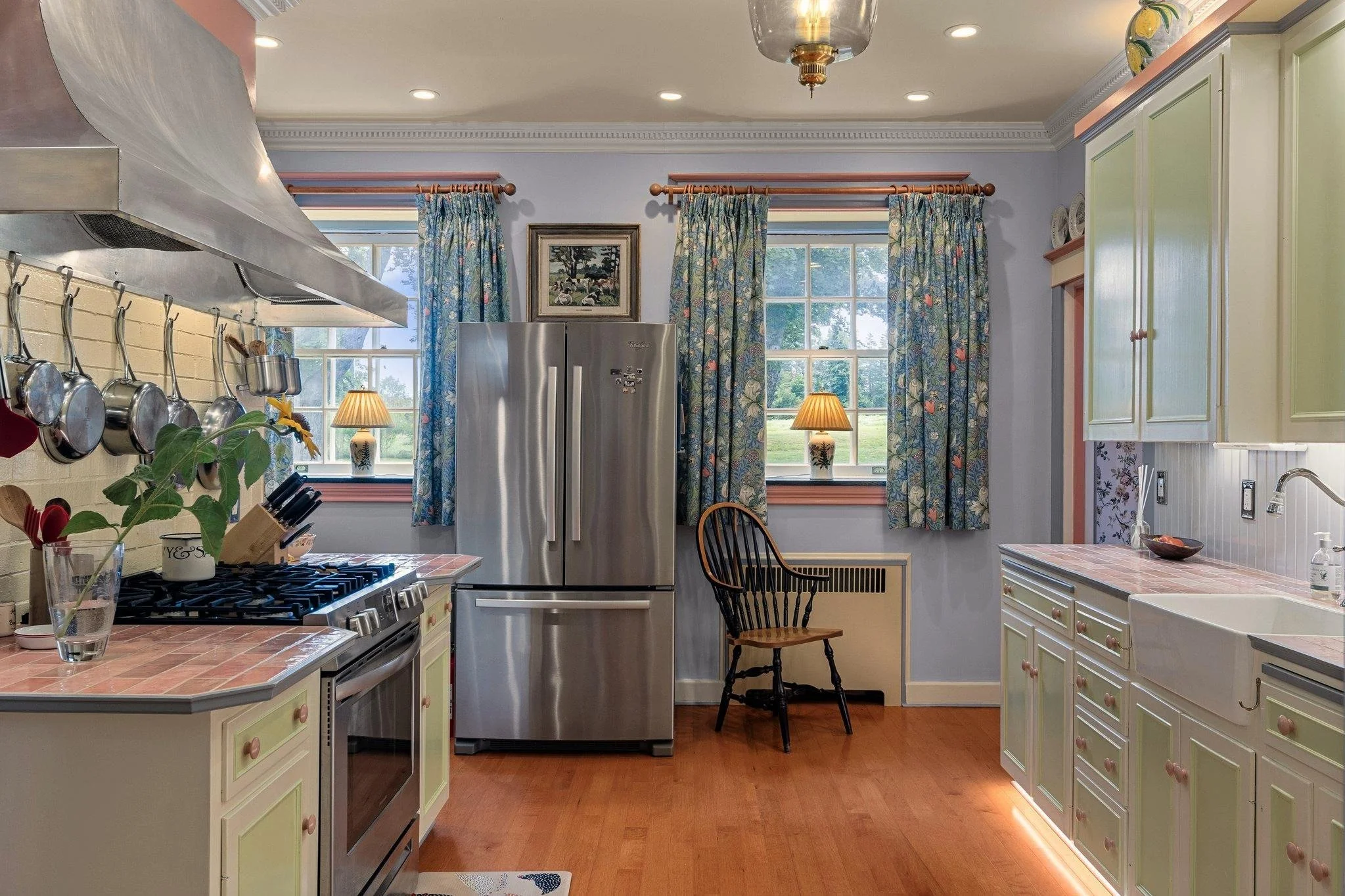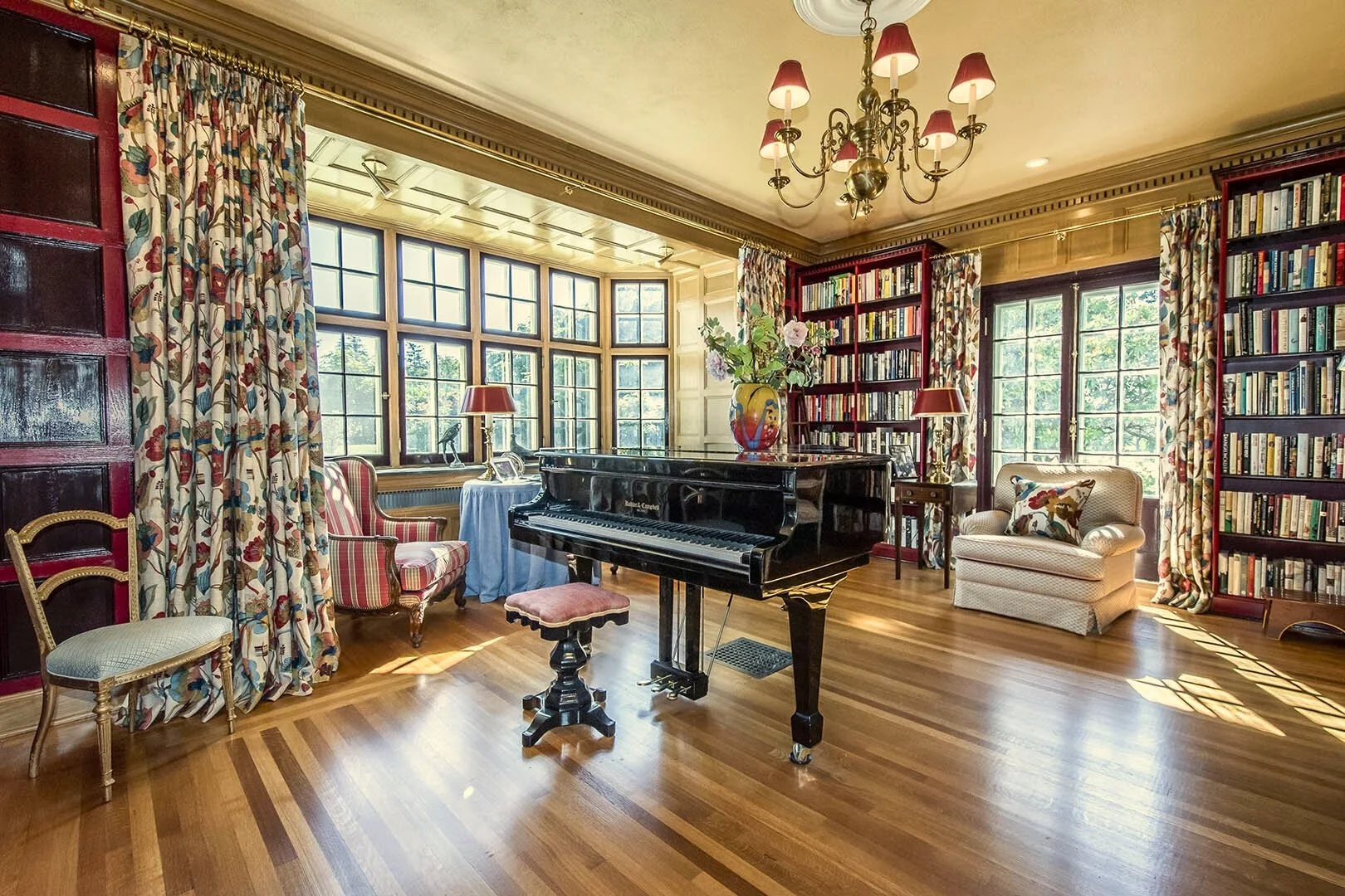 The main foyer sets the tone, with an elegant circular staircase at one end. A warm and welcoming great room anchors the west wing, with bespoke cabinetry and a Belgian, wood-burning fireplace. French doors open to a stand of rhododendrons, while bay windows illumine the space at either end. The east wing features a country kitchen, butler’s pantry, and dining room, while both bathrooms have been modernised.