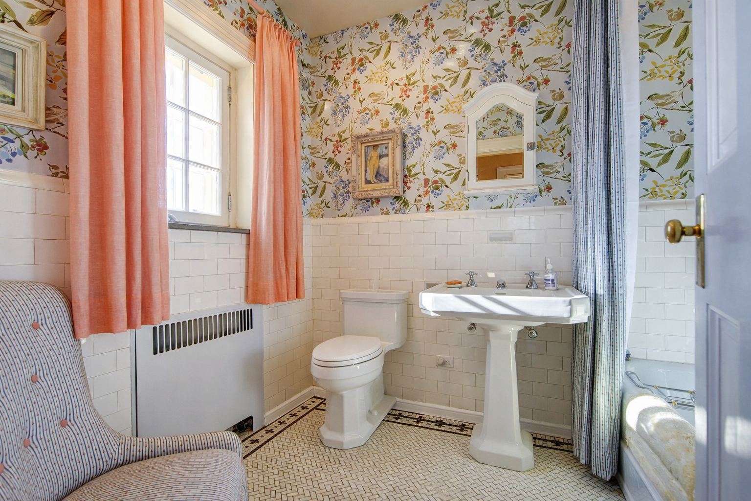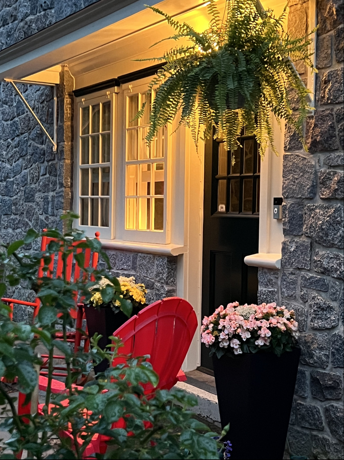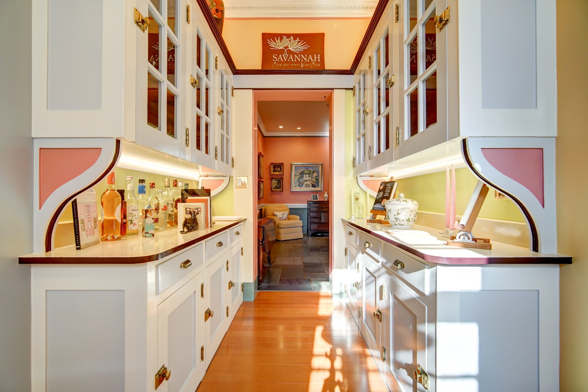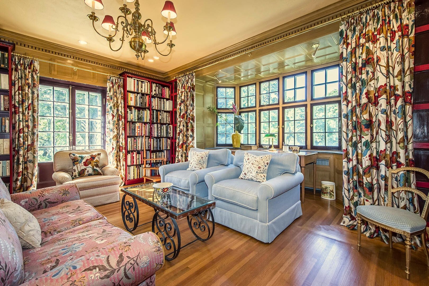 The main foyer sets the tone, with an elegant circular staircase at one end. A warm and welcoming great room anchors the west wing, with bespoke cabinetry and a Belgian, wood-burning fireplace. French doors open to a stand of rhododendrons, while bay windows illumine the space at either end. The east wing features a country kitchen, butler’s pantry, and dining room, while both bathrooms have been modernised.