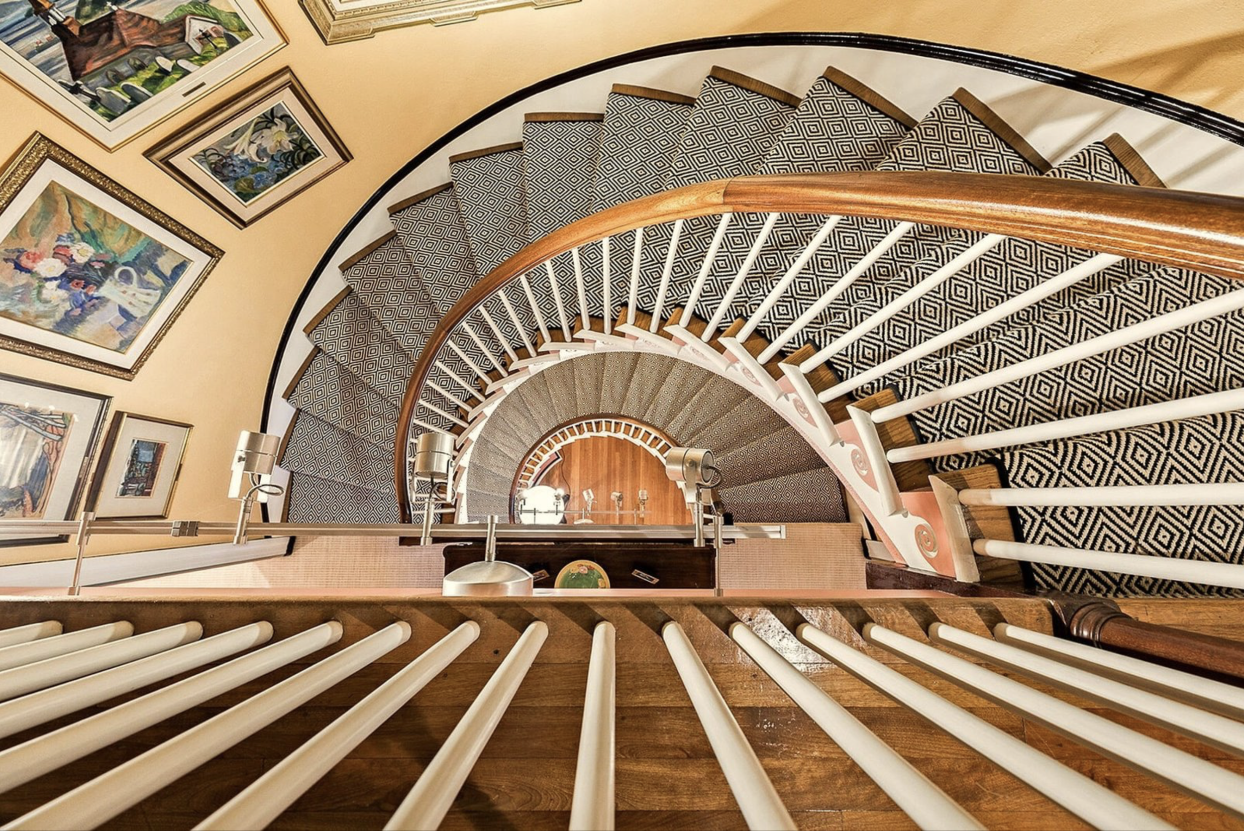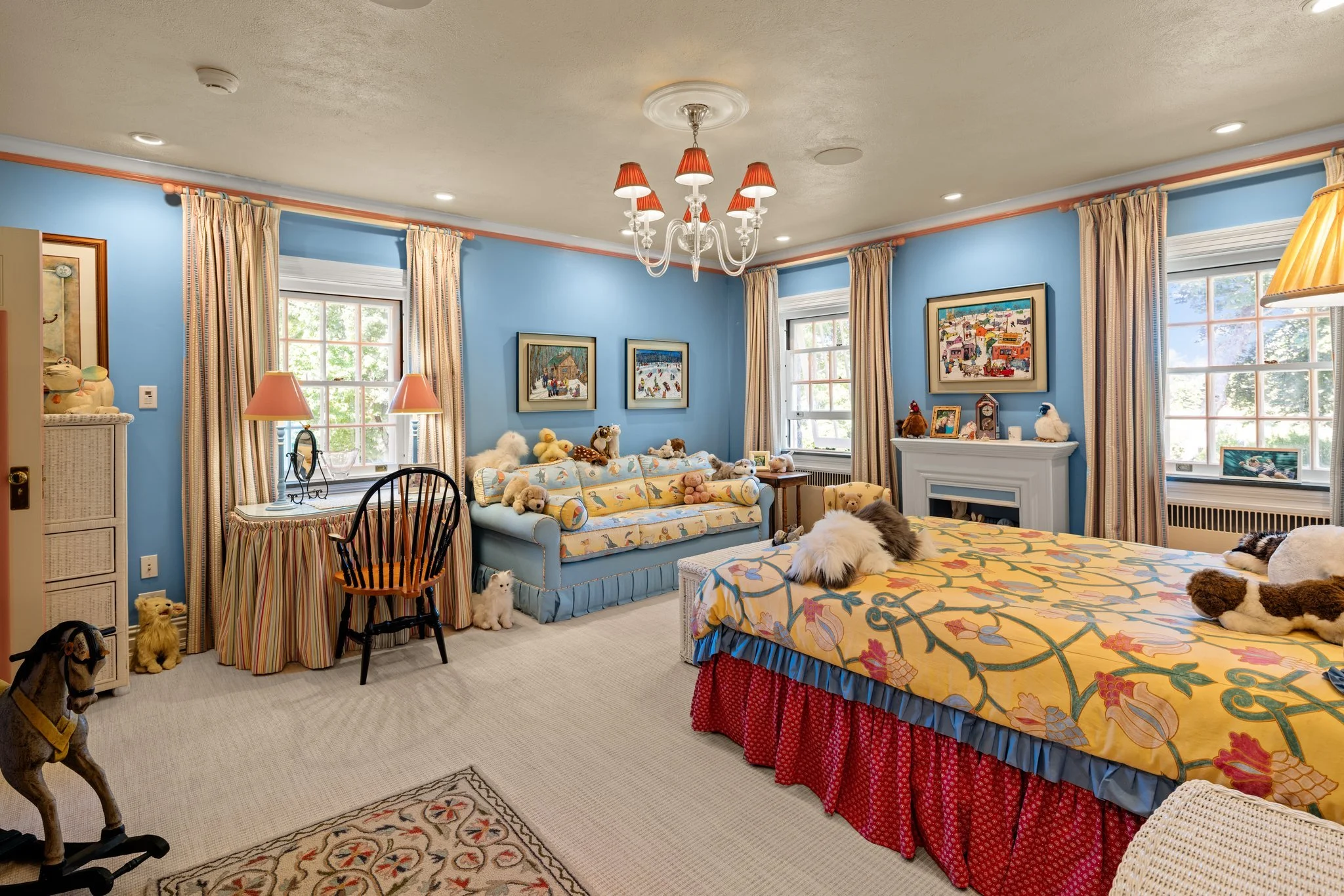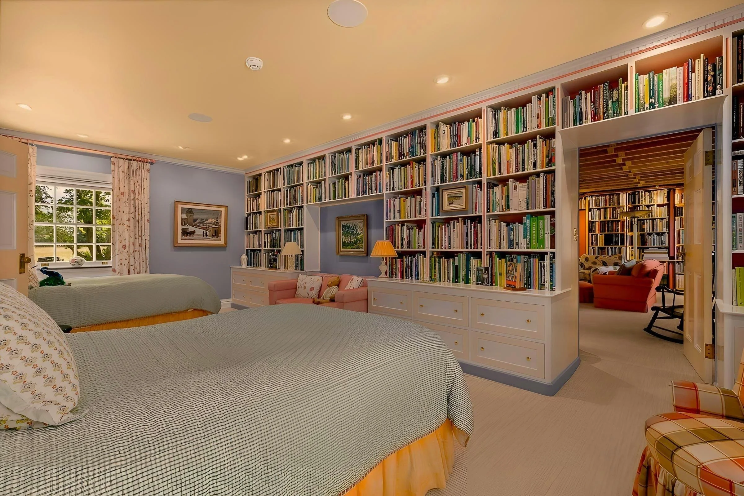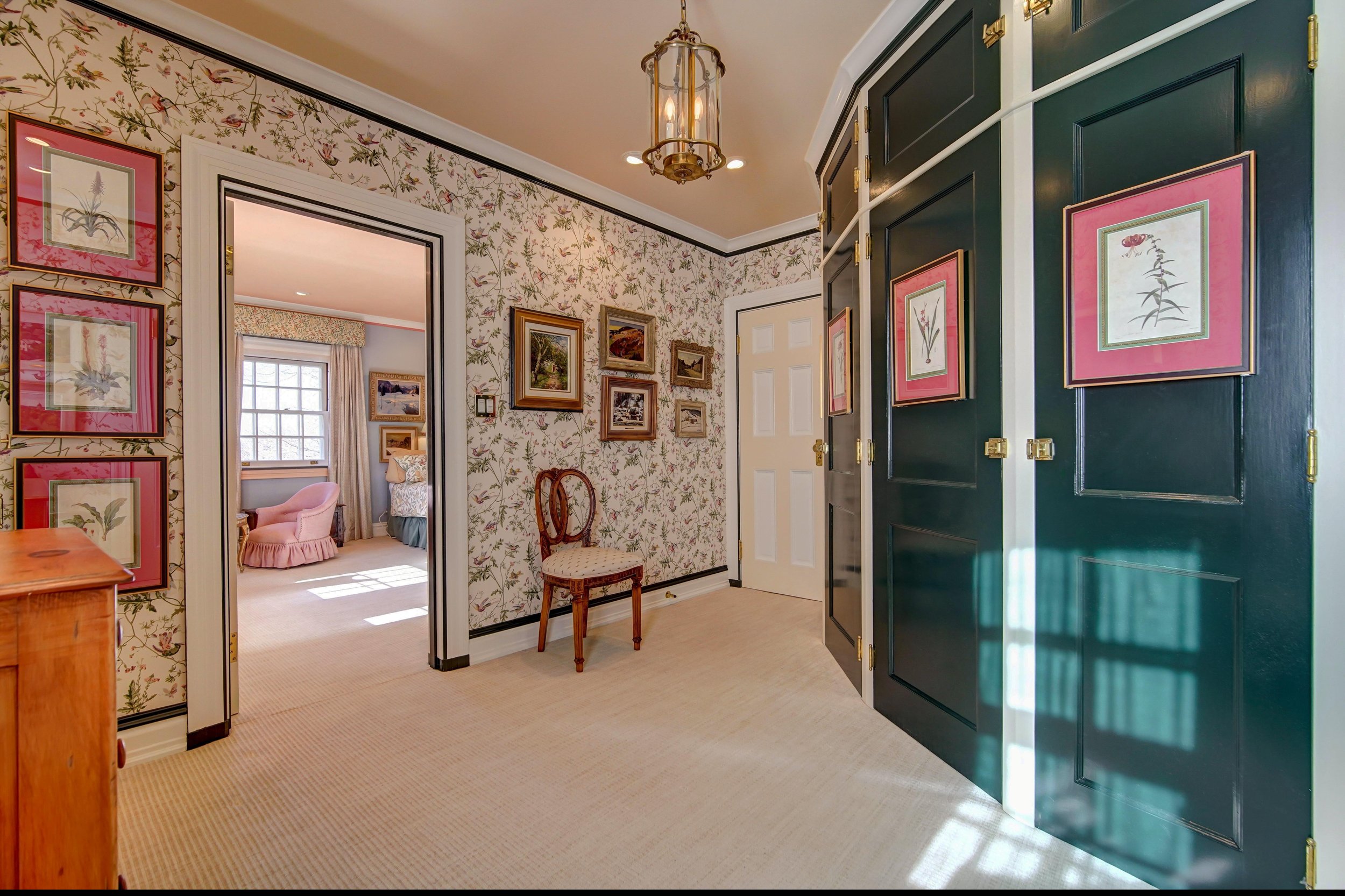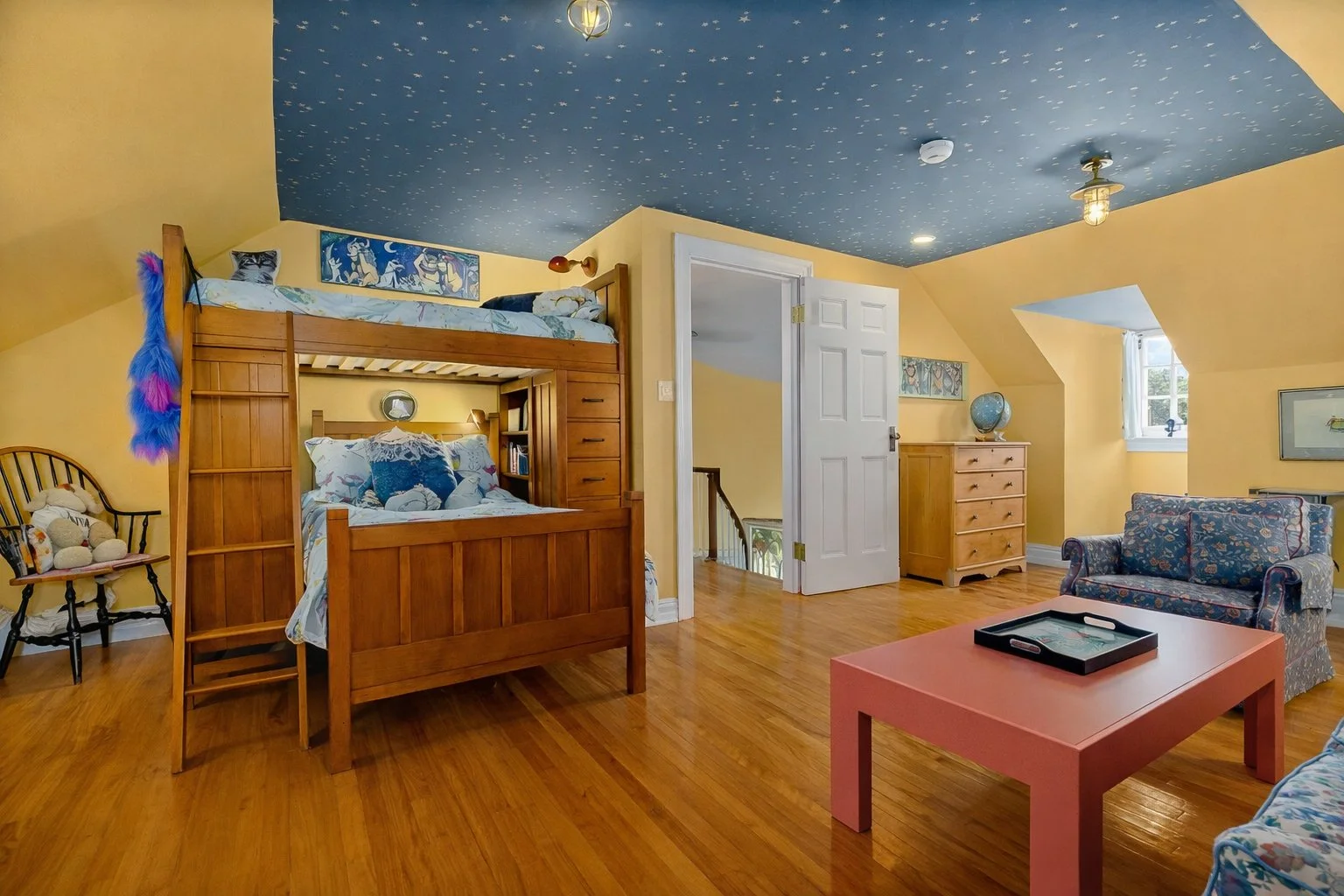 The second-floor landing splits the bedrooms into two wings, each with a specific layout and attributes. The primary bedroom features access to the media room, carved out of the former servants’ quarters, a dressing room and an ensuite bathroom with whirlpool, along with two additional full bathrooms and several walk-in closets for additional comfort and space. The top floor has an additional fifth bedroom, with a bunk bed, large closet, and plentiful storage space.