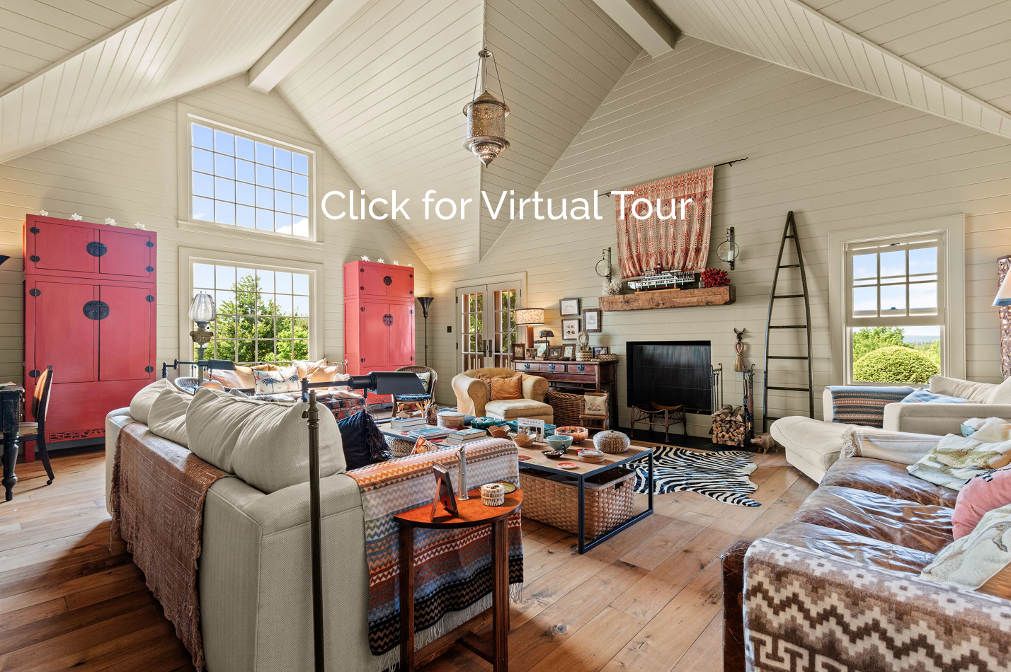 Anchoring the estate is the ground floor, open kitchen dining area with adjacent living and bunk rooms. The kitchen is a masterfully designed galley arrangement of antique style cabinetry, concrete countertops, and integrated panel appliances (2 Liebherr fridge/freezers, and two Miele dishwashers). The island, featuring a 48” Viking dual-gas range and bar sink, opens the space seamlessly, with vaulted ceiling enveloping the dining room, which sports in turn hand-hewn beams and ceiling dormer windows.